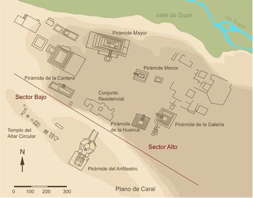 [3]The pyramid city of Caral in the Supe Valley north of Lima, Peru is approx 5000 years old - one of the "first cities" in the Americas. Click on image to see plan magnified.