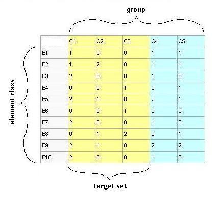 Application of the method begins with construction of an attribute-valued system in truth table[3] or spreadsheet form with elements listed in the left most column beginning in the second row. Characteristics[4] are listed in the first row beginning in the second column with the title of the attributes in the upper left most cell. Normally the file name of the data is given the title of the element class. The values which connect each characteristic with each element are placed in the intersecting cells. Selecting characteristics which all elements share may be the most difficult part of creating a database which can utilizing this method.